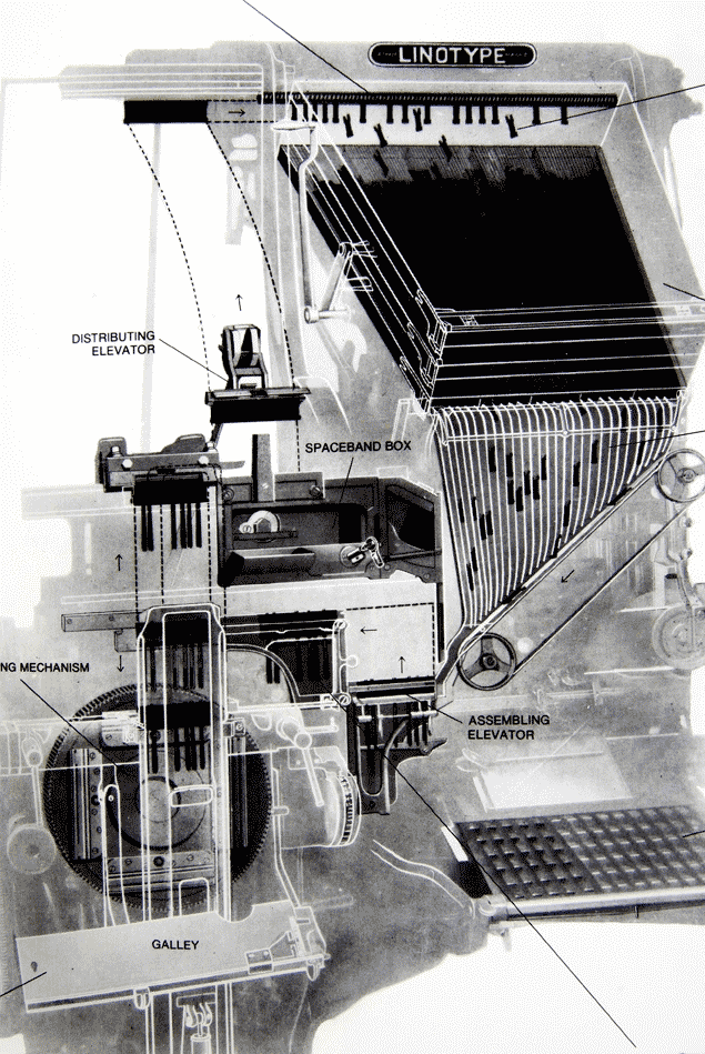 la machine à composer Linotype inventée en 1886 par Ottmar Mergenthaler à Baltimore. Elle fut suivi de près par l’InterType développée vers 1911. Ces machines composaient non des lettres mais des lignes, litéralement des Line-of-Type, fondus d’un bloc. Puis les bloc-lignes étaient montés sur le «marbre», une table métallique où l’on pouvait «tacquer» correctement toutes les lignes. La partie gauche de la machine est la fondeuse. L’on peut imaginer les émanations d’antimoine que respiraient les typographes clavistes de l’époque. On ne parlait pas encore de santé professionnelle, ni de risques majeures et les maladies comme le «saturnisme» étaient bien souvent tournés en ridicule, traités au canons de rouge pour oublier les souffrances physiques.