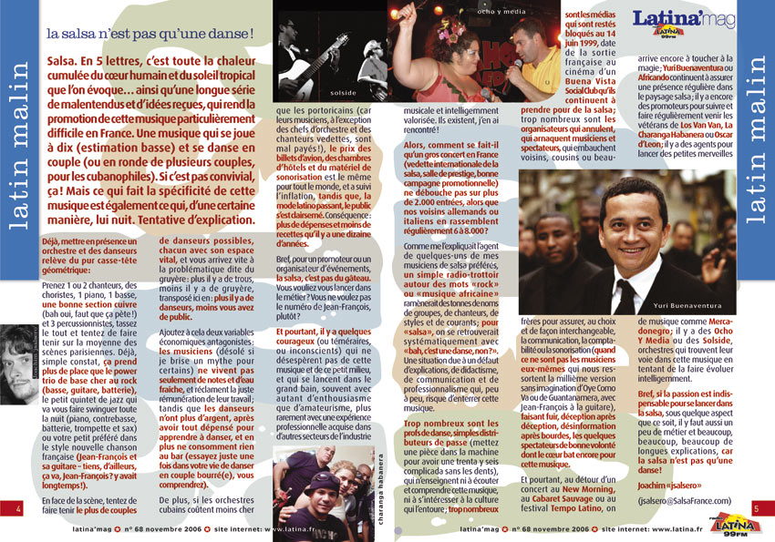 Voici un digest de mes plus belles pages que j’ai conçu pour Radio Latina. Une occasion pour votre serviteur d’expérimenter d’autres champs graphiques que les rapports financiers ou la presse d’entreprise. Une opportunité également de revisiter la photographie de scène pour laquelle je me suis pris de passion comme vous avez pu vous en rendre compte. Pourquoi Radio Latina a-t-elle arrêté Latina Mag. Un de ces exemples de la perversion du système capitaliste que j’aborrhe. Fin 2006, le groupe Start se porte acquéreur de la Radio. Comprenez par là d’une fréquence FM (99FM). Ils présentent le dossier au CSA qui les retoquent une première fois pour des raisons évidentes. Plus rien de l’objet culturel qui était couché dans le dossier historique de la Radio n’y figurait. Il faut bien comprendre qu’au delà des grandes fréquences nationales ou des NRJ et itou, il y a une flopée de petites fréquences dont l’audience oscille entre 1 et 3% de part de marché. Le groupe Start possède déjà quelques petites fréquences et cela lui permet de faire tourner une régie publicitaire. À la deuxième présentation du dossier en décembre (eh oui le CSA autorise le repêchage) l’autorité de régulation a accepté le projet…