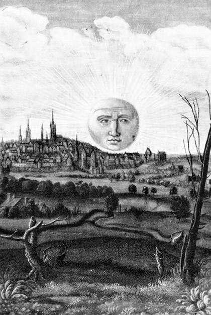 Soleil sculpté sur un bahut des Grisons (Suisse), au XVIIe siècle.