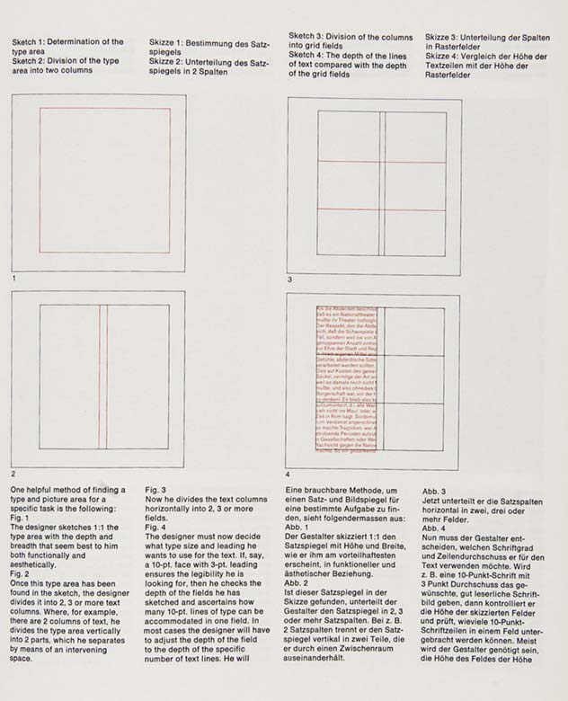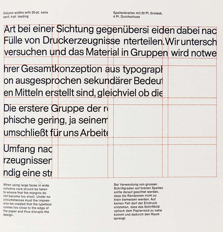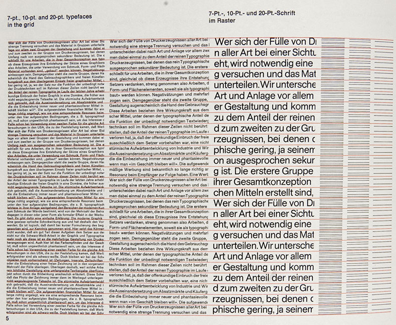 L’intérêt de cet ouvrage est d’aligner page après page, de manière exhaustive les variations de structures verticales et horizontales, de montrer comment les blancs doivent dans chaque cas s’organiser, et surtout d’insister sur la texture typographique qu’engendrent les solutions de découpage. Corps et interligne sont au centre de ces réflexions pragmatiques… vous réduisez la colonne, le nombre de signe par ligne doit suivre homothétiquement donc le corps doit diminuer. L’interlignage de même, participe de la lisibilité des colonnes et Brockmann donne les clés de ces variations.