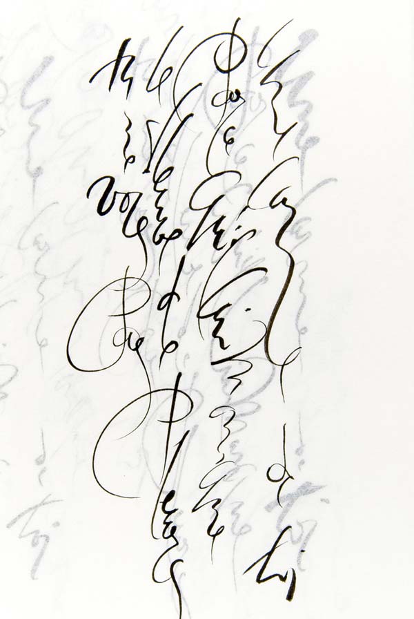 J’ai rencontré Soheil Azzam un jour de février dernier, (il y a deux ans de cela). Cela faisait longtemps qu’il laissait des commentaires très fouillés sur des sujets aussi variés que la calligraphie ou la mise en page, puis un jour on s’est téléphoné. Il habite en Suisse et rendez-vous fut pris pour un dîner parisien auquel assista également Jonathan. La vie de Soheil n’est pas simple, Moyen Orient puis la Suisse, et enfin la Chine. Ah l’amour, toujours l’amour en roulant les rrrr à la hongroise. Il fut pris de passion à la fois pour une femme et pour son pays, mais surtout pour la calligraphie. Après des études laborieuses helvètiques, il s’expatria qq temps en Chine où il apprit également les rudiments de la langue. Puis il revient dans la cuvette montagneuse pour y exercer finalement son métier avec une rigueur et une fantaisie enpreintes d’une très grande sensibilité. Il m’a laissé quelques pdf que j’ai traduit en galerie de son œuvre graphique et aussi des carnets de notes en vrac que j’ai photographié pour l’intérêt qu’ils témoignent pour l’entrainement constant à l’écriture et au tracé calligraphique.