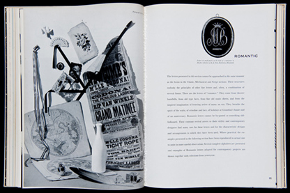 C’est-à-dire que nous sommes aussi avant les travaux de Maximilien Vox et d’Albert Hollenstein qui ont créé la fameuse classification Vox-Atypi. Alors qu’est ce qui fait l’intérêt de ce recueil de «poèmes» typographiques? Sans doute l’étendue des documents. Sans doute aussi le souci de l’auteur de ne rien oublier. Bien que, bien que. Nous sommes là en présence d’une classification américaine donc extrêmement réductrice là ou Vox et plus tard Allessandrini ont essayé de «décrypter» les familles de caractères selon des typologies beaucoup plus fines.