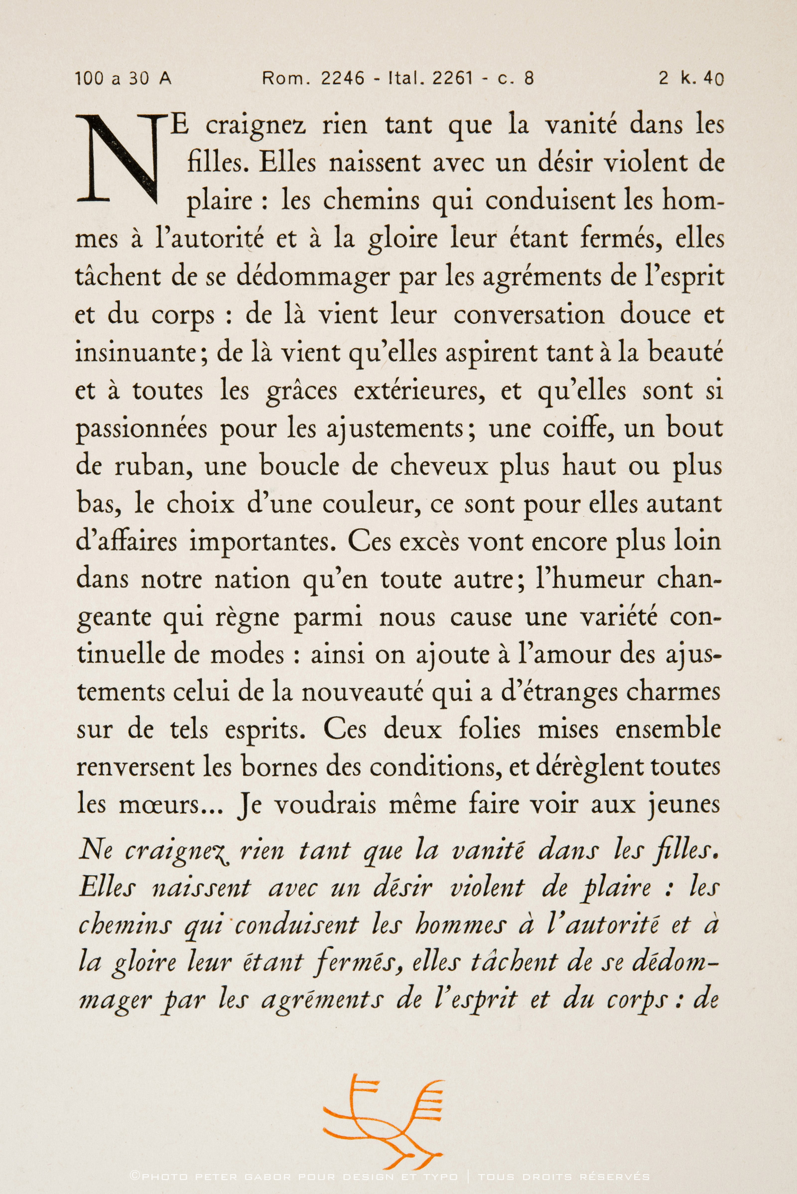 “Après de longues années d’études et de mise au point) la réalisation du « caractère d’après Garamont ») qui fut commencée en 1912 sur l’initiative de Georges Peignot) est aujourd’hui complètement terminée. Nous avons conscience d’avoir ainsi doté la typographie française d’un moyen d’expression bien à elle) et qui faisait défaut jusqu’à présent dans la gamme de nos créations nationales. La plaquette de présentation est en cours d’exécution) mais nous tenons dès à présent à la disposition de nos clients des spécimens de tous les corps ainsi que des lettrines et vignettes anciennes et modernes gravées pour le Garamont.”