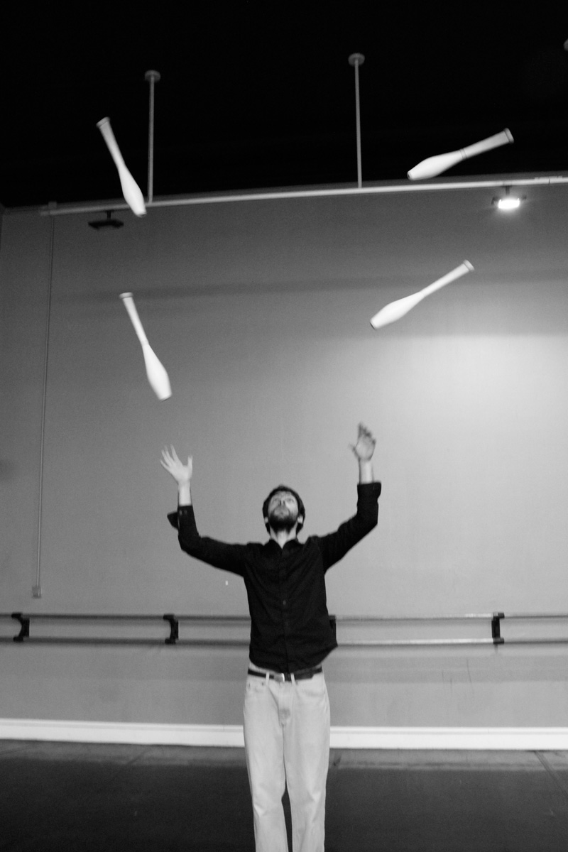 J’ai redécouvert le jonglage il y a quelques années, et j’assiste depuis régulièrement à des spectacles. Dans le jonglage contemporain, la relation que peuvent entretenir les jongleurs avec leurs massues m’a particulièrement marquée. C’est une relation très intime, les jongleurs vivent littéralement avec leurs massues : pendant la semaine, ils s’entraînent, le soir, ils vont voir des spectacles de jonglage, et le week-end, ils vont aux rencontres de jongleurs qui se retrouvent pour des compétitions. On pourrait aller plus loin en disant que la massue est un peu comme un prolongement du corps du jongleur, dont elle représente quasiment un membre supplémentaire. C’est pourquoi l’idée m’est venue de choisir comme thème de mon reportage artistique l’histoire de cette relation particulière entretenue entre un jongleur et sa massue. J’ai choisi de photographier deux jongleurs, dont l’un est complètement autodidacte et l’autre vient d’une école de cirque.