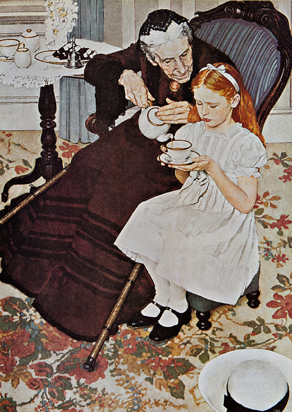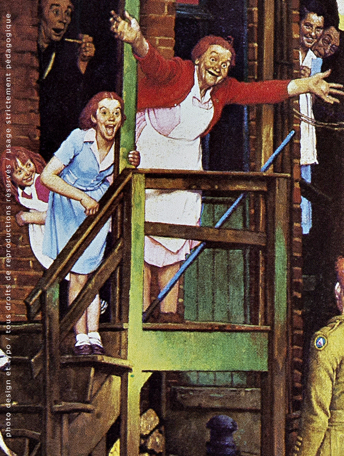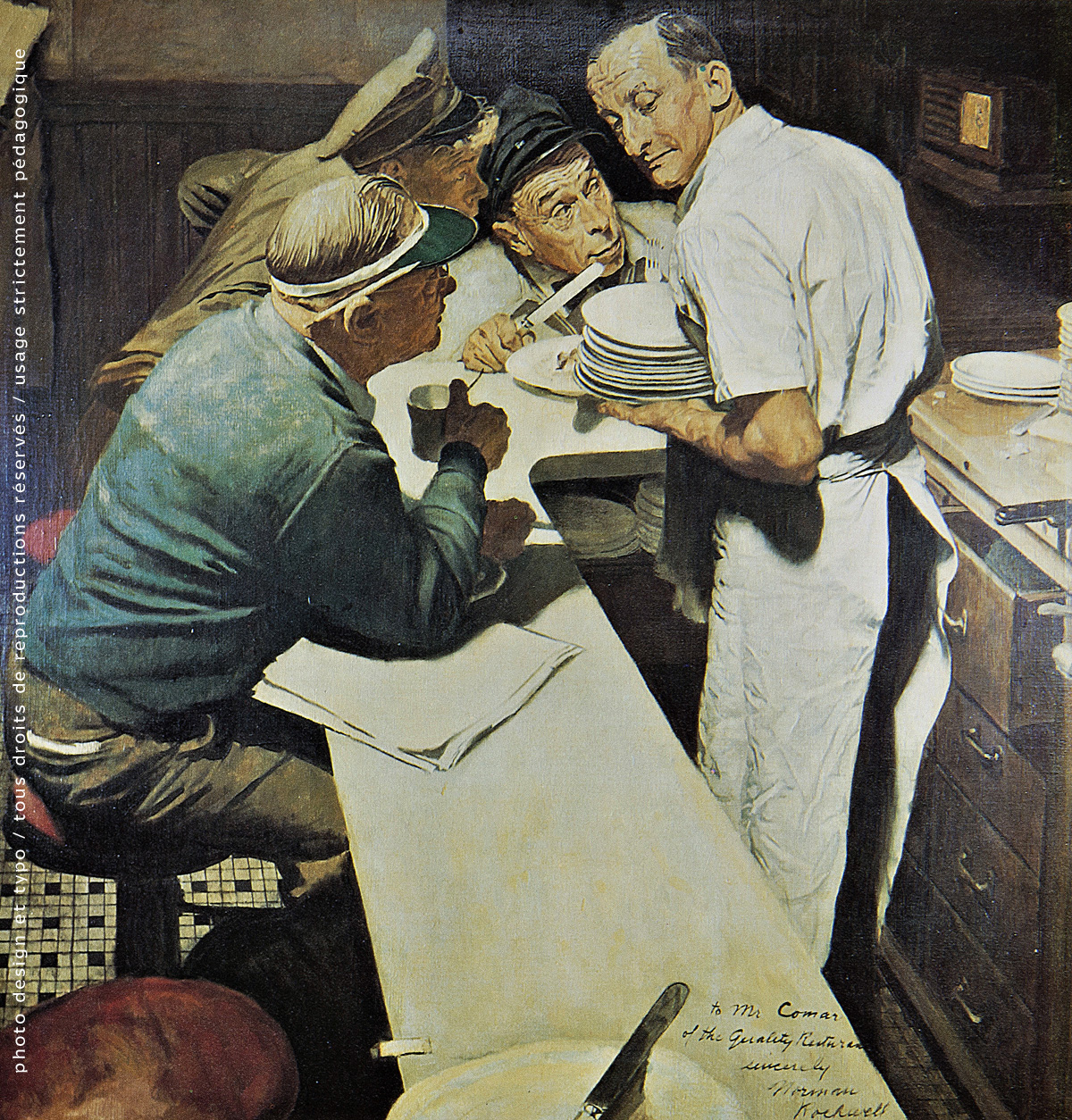 Parce que l’Histoire avec une grande Hache, échappait aux États-Unis, trop jeune état pour se sourcer dans les mythes de l’Antiquité ou les chansons de geste du Moyen Âge, les américains ont développé une véritable culture non pas du romantisme mais de la romance comme nous le suggère Denis de Rougemont dans son essai sur l’Amour en Occident. Ce faisant ils ont inventé le Story Telling, qui est non pas l’art de raconter mais bien plus l’art d’embellir une histoire, la plus banale qui soit. Et N.Rockwell sera là une des figures les plus emblématiques de cette catégorie plutôt journalistique que littéraire.