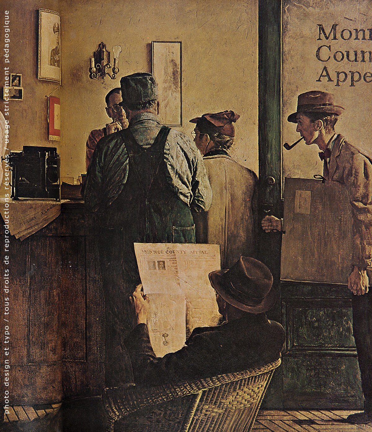 Norman Rockwell est pour le versant de l’Illustration le grand représentant d’une lignée d’artistes qui vont peindre et dépeindre une Amérique tantôt exsangue par la crise de 29, tantôt flamboyante de puissance vers 1969 lorsque la NASA fait alunir le LEM pour déposer sur la Lune l’Astronaute Neil Armstrong. Rockwell aura traversé ce XXe siècle de part en part avec cette même gourmandise, cette même passion pour le dessin quotidien, qu’un journaliste peut suivre d’élections en élections, de Tour de France en Tour de France les actualités de quelque 50 ans d’activités humaines. Rockwell est pour cela un génie de l’observation et si je parle de journalisme, bien sûr, il suffit de voir son œuvre pour comprendre que c’était là, avec le Saturday Evening Post, sa principale source de revenus durant au moins les deux-tiers de sa carrière.