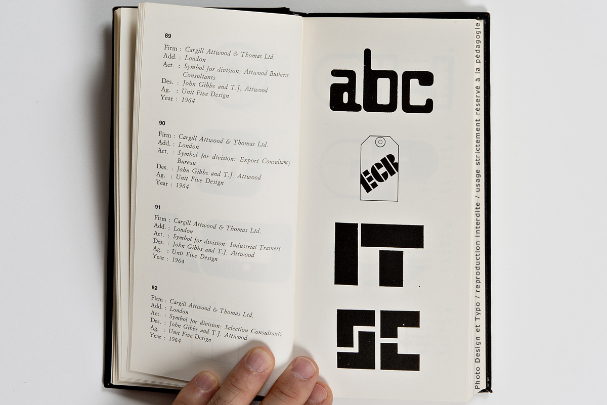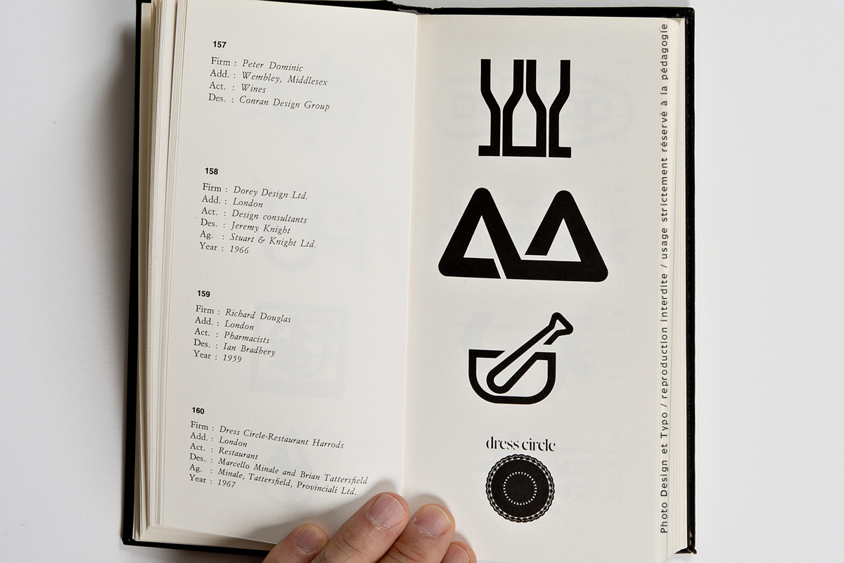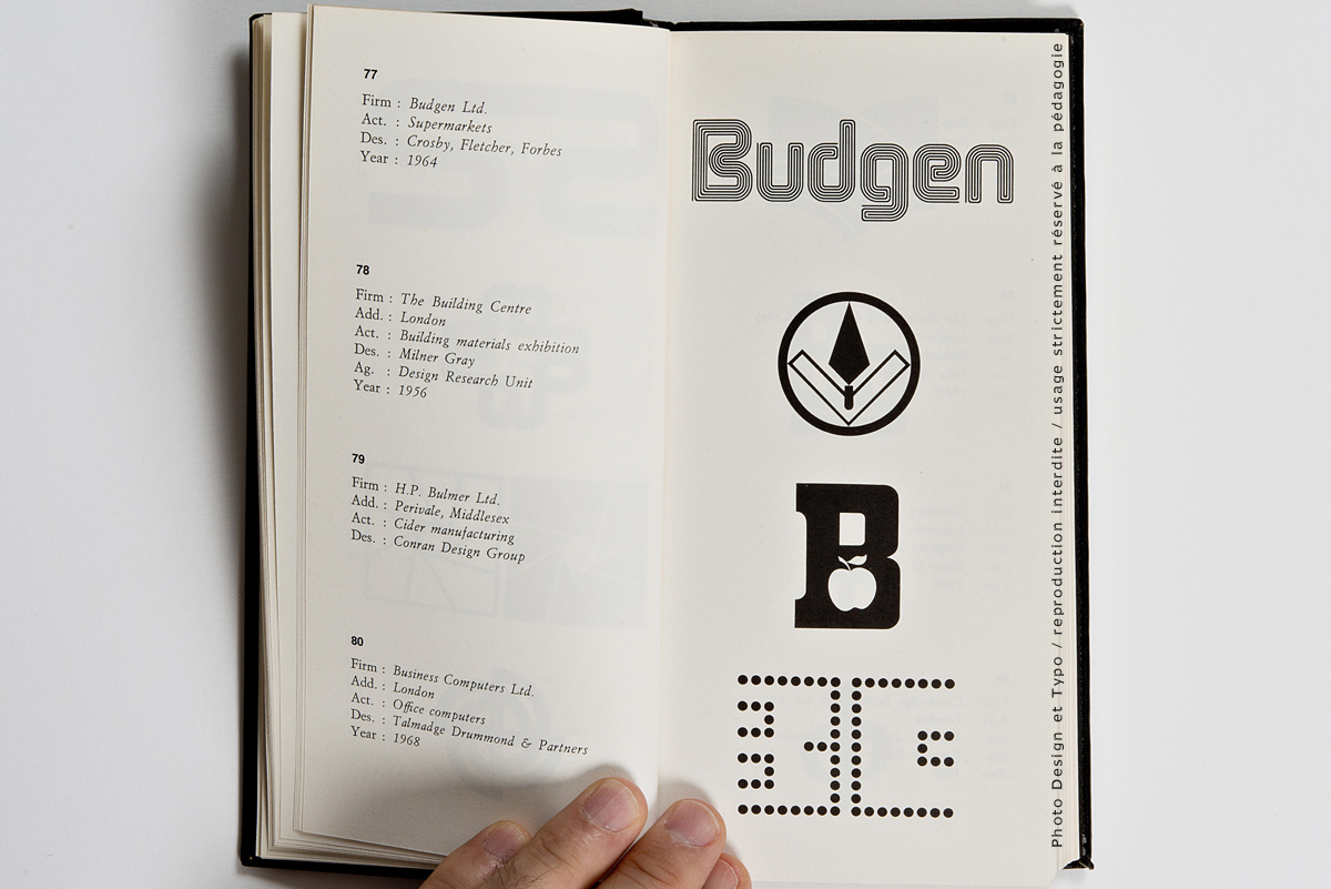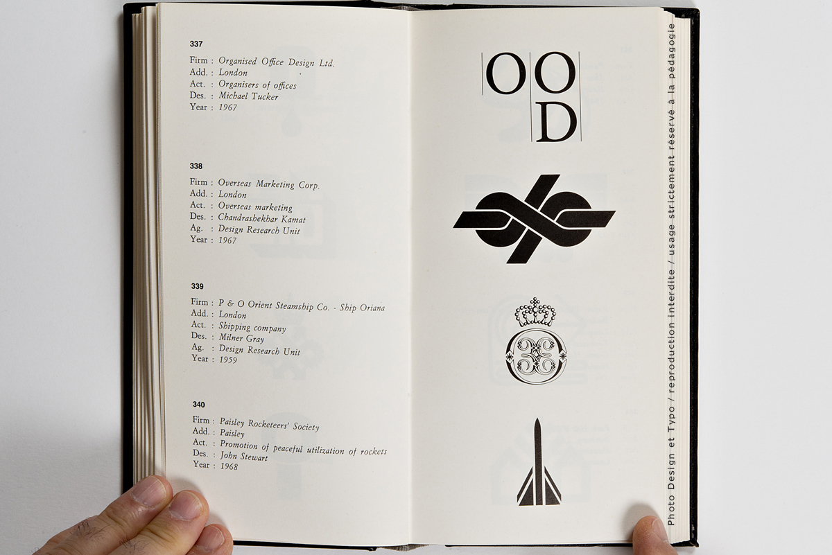 Ce n’est pas moins de 205 pages et environ 700 trademark dont il s’agit là. La fin des marques des USA (publiés dans le premier volume) et une quantité impressionnante de marques venant d’Angleterre, d’Irlande et du Benelux. Chacun des trademarks se trouve accompagné de la nomenclature de ses créateurs: le Client, son origine géographique, son secteur d’activité, le Designer et l’Agence en charge du budget ainsi que l’année de sa création. On imagine sans peine le back office nécessaire à ce travail de fourmi à une époque où Internet n’existait pas encore. Il est à parier que tout ce travail organisationnel a été effectué par courrier postal et peut-être par téléphone.