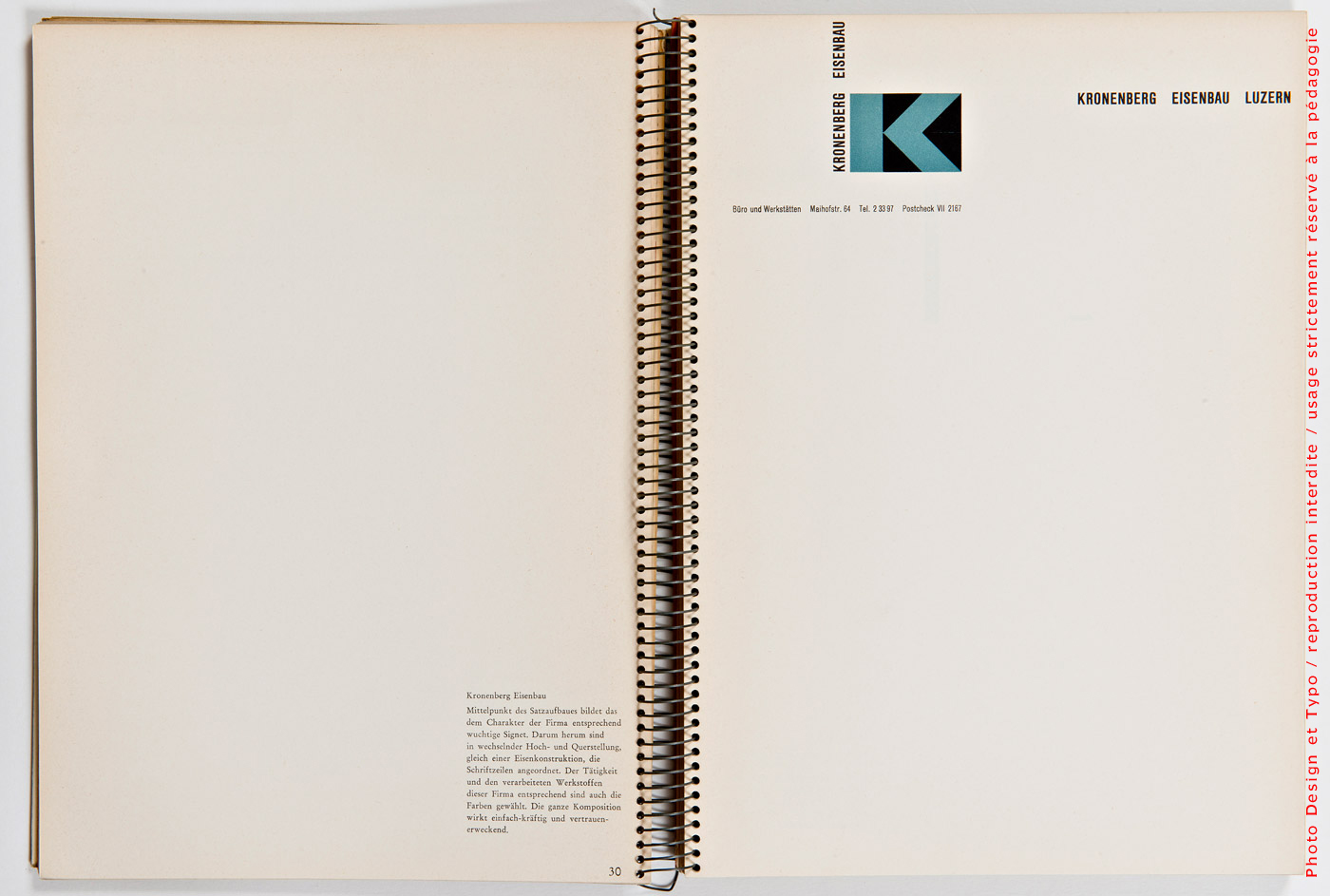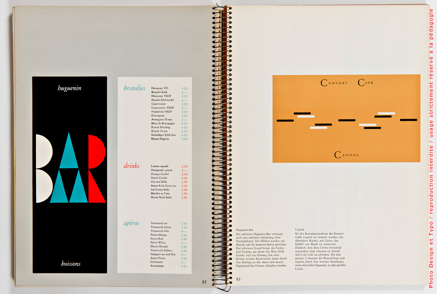 Cet album témoigne de la versatilité des moyens typographiques pour créer, logos, identités visuelles, chartes graphiques et éditions. En somme nous sommes en face d’un véritable langage graphique aux ressources infinies, où l’on voit que la lettre devient image à l’instar de ce qu’écrivait Massin dans ses ouvrages. Grande tradition suisse de même. Publié à Lucerne en Suisse en 1957, nous sommes bien après la guerre. Dans les années 50. Le monde vit la reconstruction et ces exemples de lettrages témoignent de ce désir d’architecturer l’espace, d’en faire un lieu construit à la Bauhaus. On peut regretter bien sûr que les Suisses aient peu emprunté au constructivisme Soviétique, bien qu’ayant été parmi les plus fervents promoteurs du mouvement DaDa, mais il n’en demeure pas moins qu’ils ont été largement en avance sur le reste de l’Europe. À l’exception peut-être de l’Allemagne pour les raisons que l’on connait, et l’Angleterre qui a toujours accordé une importance capitale à la calligraphie et à l’identité visuelle. Bien entendu je n’oublie pas les apports graphiques des néerlandais ni des italiens… mais voilà, il faut bien toujours qu’il y ait une première fois :) //peter gabor