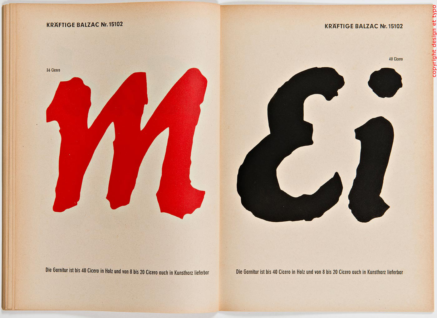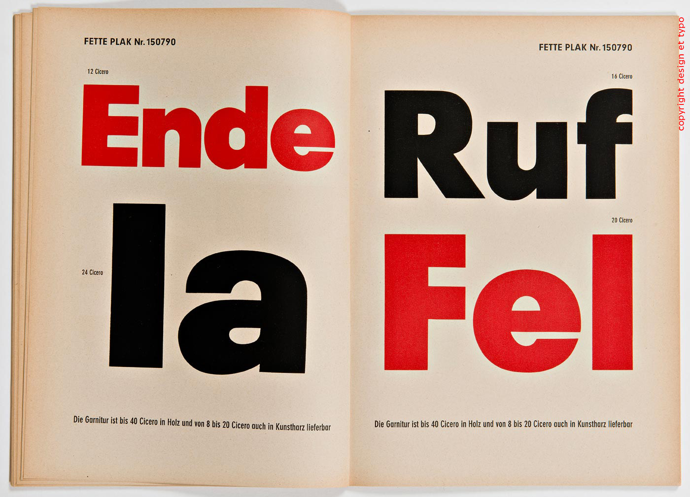 Littéralement «Écritures d’Affiche» Stempel qui de l’autre côté du Rhin constituait l’un des fleurons de la typographie traditionnelle (rachetée depuis par Linotype puis par Montotype) éditait de même que Deberny et Peignot ou la Fonderie Olive en France (qui étaient à proprement parler de tailles minuscules comparées à leurs collègues germaniques) des plaquettes de spécimen de caractères pour le même usage que je décrivais précédemment pour les spécimens de Deberny et Peignot.