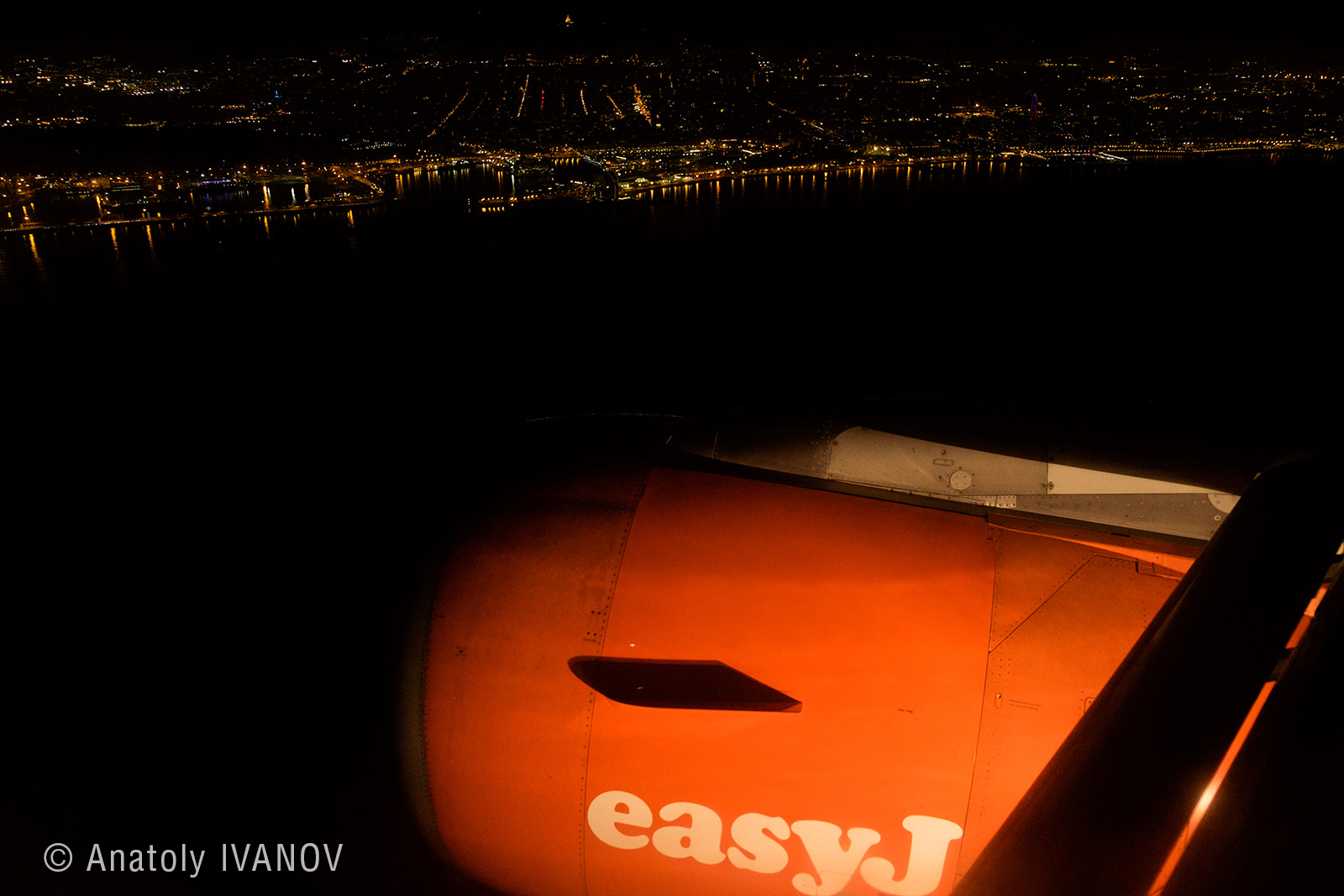 EasyJet flight from Paris Charles de Gaulle airport landed on runway 25R in Barcelona El Prat airport after sunset.