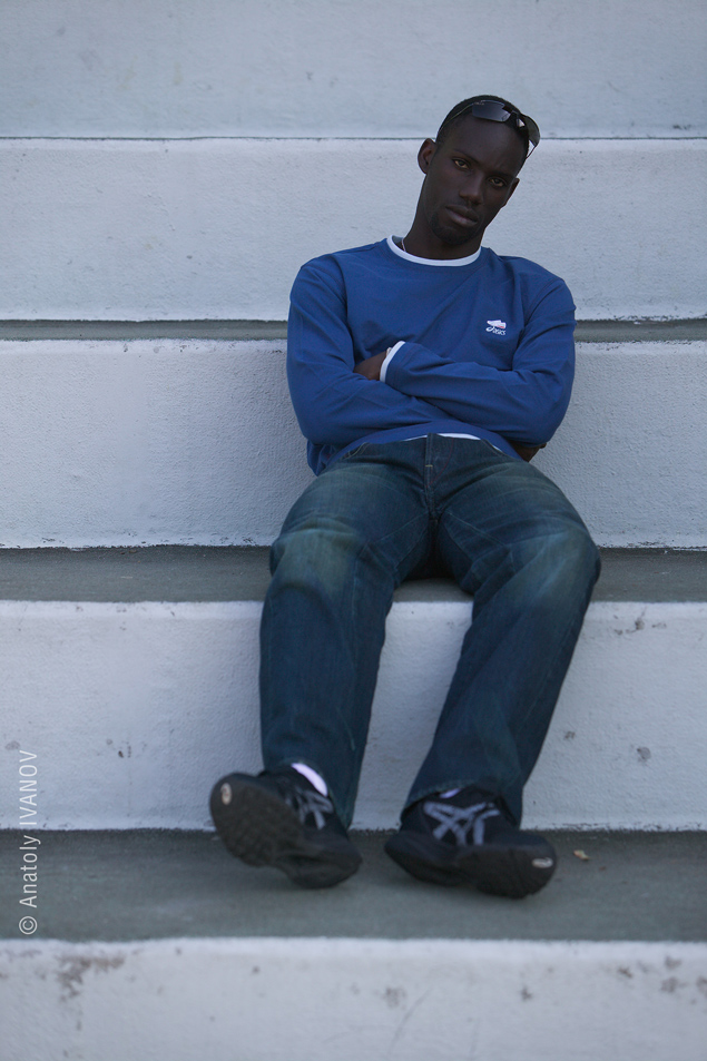 France athletics (track running) national team’s Marc RAQUIL (hair tainted in blond, 27 years old in 2004) and Leslie DJHONE (black hair, 23 years old in 2004) are training at the track of the city of Nogent-sur-Marne near Paris, France. Record setting runners, they specialize in sprint distances of 200m and 400m, both as individual and relay. Sponsored by Japanese shoe maker Asics, Gaz de France, Oakley and the city of Nogent, they are wearing a sportswear collection by Asics.