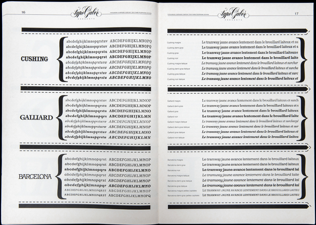 Présenter un caractère, nouveau, qui nous vient tout droit des laboratoires de recherche d’Alphatype demandait un travail considérable. Tester les polices. Retravailler toutes les tables d’approches en fonction de la langue française (merci Serge Cortesi). Alors vous imaginez bien Trois familles de polices, Barcelona, Cushing et Galliard, avec toutes les déclinaisons de romains et d’italiques. Un travail de fourmi. Énorme. Et c’est une fois cette préparation accomplie que nous pouvions seulement faire la promotion des nouveautés dans nos magazines. On n’imagine absolument pas la charge, la pression et le travail que cela représentait. Qui de plus est, lorsque vous êtes victimes de votre notoriété de qualité, le trac vous assaille chaque jour. Faire mieux et toujours mieux. Et rester convivial et calme avec ses collaborateurs et ses clients. Pas toujours simple. Mais une aventure si belle.