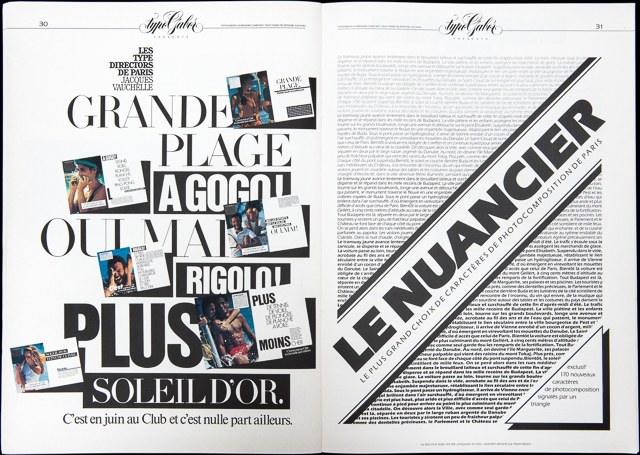 Couverture composée en Barcelona ITC. Cette couverture est l’une des plus étrange de toute la collection des magazines typoGabor Présente. De fait c’était un clin d’œil à la profession publicitaire. Il n’y avait pas de Type Director dans les Agences Parisiennes. À part Allison Girard qui travaillait (si ma mémoire ne me fait pas défaut) à la JWT, il n’y avait jamais eu de typeDirector en France. Et même aujourd’hui, encore, je n’en connais qu’un seul, Thomas Linard, de mes amis. Les raisons sont innombrables. La France n’a jamais privilégié la typoGraphie jusqu’à encore récemment. C’est sans doute les nouveaux outils du numérique, qui ont donné l’accès à la création typographique, sans plus être obligé de gratter de la carte, que les Directeurs Artistiques contemporains font assaut de créativité, soit en redessinant des typos, soit en les faisant redessiner par quelques studios spécialisés.