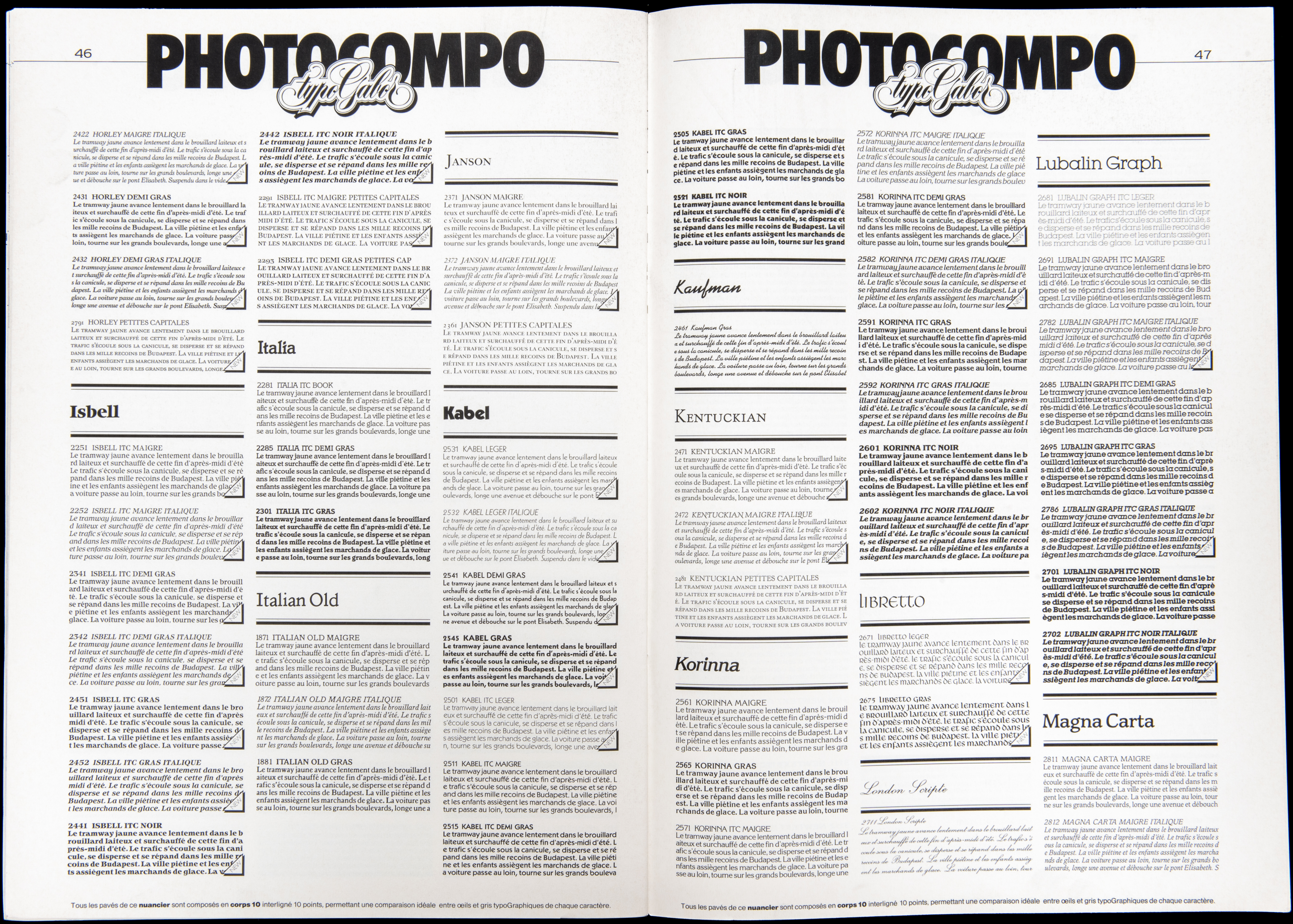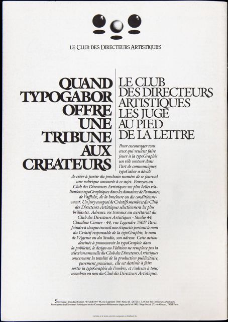 Un système de composition américain venant de Chicago, qui pour la première fois, propose non plus d’acheter mais de louer (prix dérisoire) des polices de caractères, ce qui porte l’offre et la diversité typographiques à un niveau inédit : 1 000 polices contre 80 sur Diatronic auxquels s’ajoutent 16 polices supplémentaires tous les mois. « typoGabor présente » naît en 1980 de deux constats.