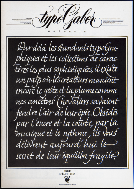 Nous sommes donc enfin sur le bon chemin. L’outil de production Alphatype ayant remplacé avantageusement les Diatronic de Berthold, nous lancions un programme de communication annuelle qui débordait d’inventivité et de présence dans les agences de publicité. Ici une couverture entièrement calligraphiée par Albert Boton. Lui avais donné ce texte un peu grandiloquent mais qui résumait bien la foi que nous avions dans l’avenir des technologies numériques. Au point d’ailleurs que Berthold s’était mis en tête de racheter la société Alphatype pour proposer les mêmes technologies à leurs clients.