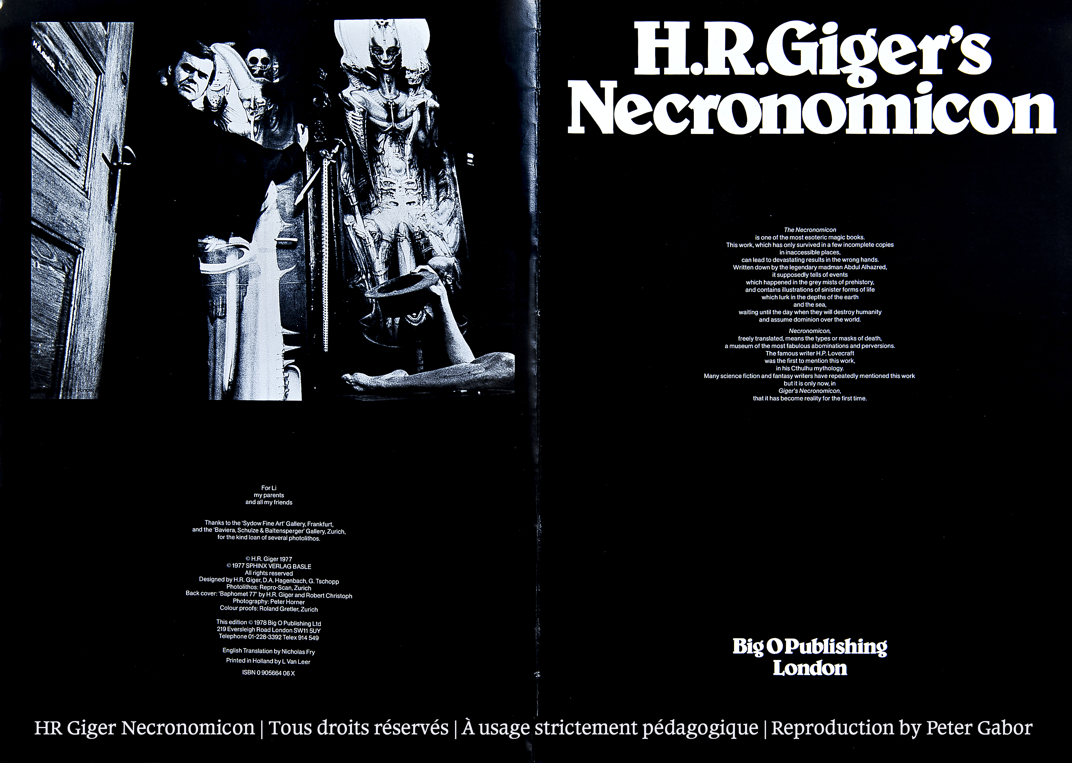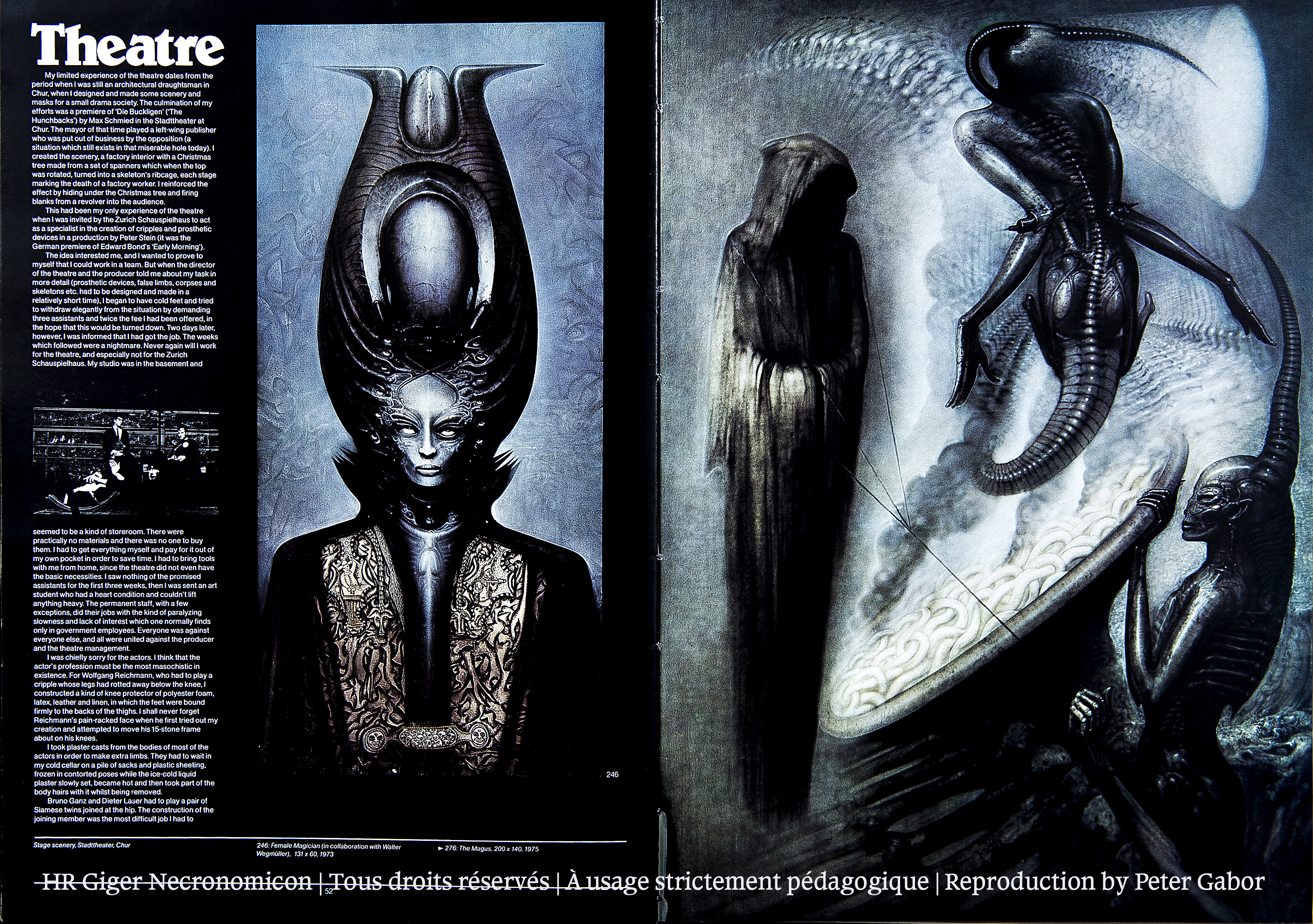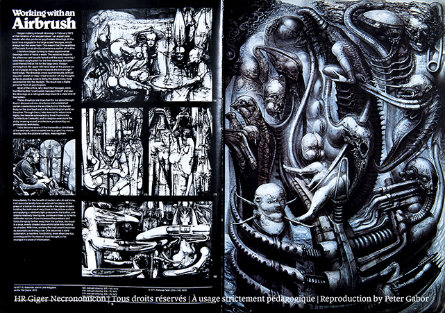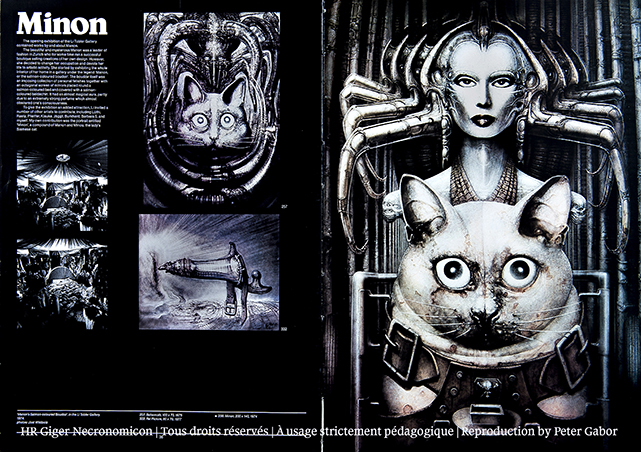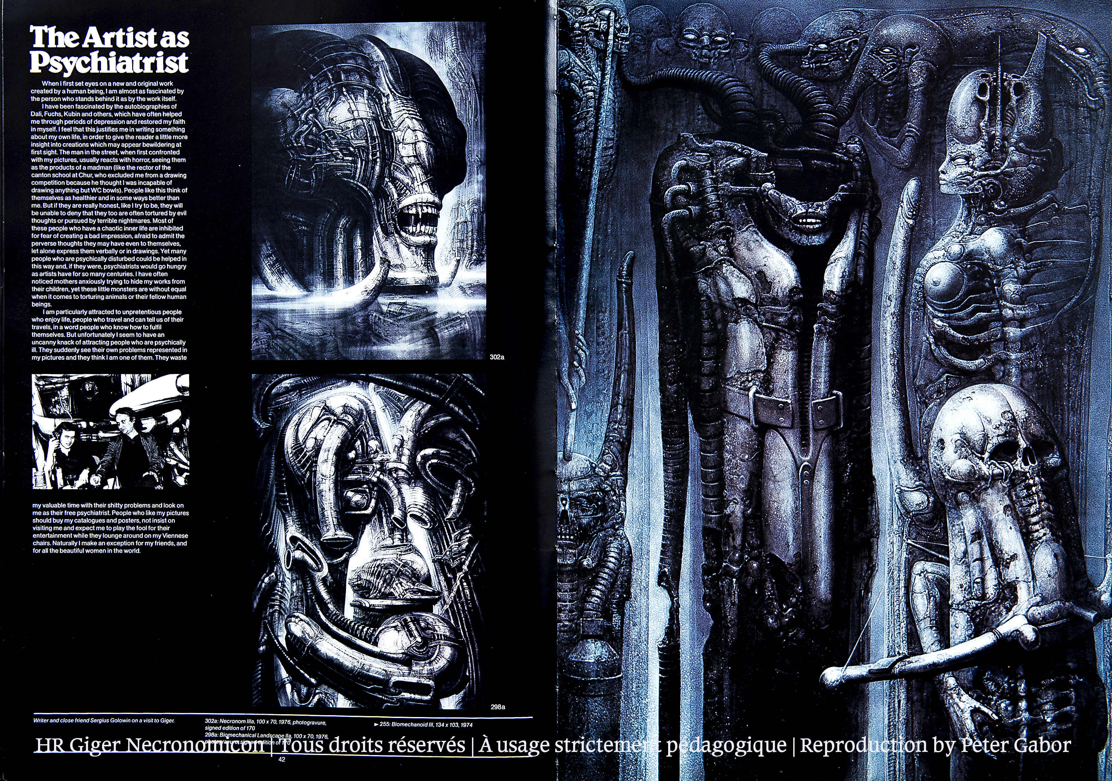 Matériau ayant servi à réaliser ce montage. Il s’agit d’un album que je timbale depuis près de vingt ans dans ma bibliothèque. J’ai toujours été persuadé qu’on ne peut pas comprendre ces images si l’on n’y fait pas un focus et qu’on ne se ballade pas entre les visions et les expressions complètement délirantes de Giger. Apprendre à regarder, cela demande une certaine lenteur. Un voyage interstellaire entre les obsessions et les textures de la réalité que veut nous imposer Giger. D’où la naissance de cette vidéo. Mais vous l’aurez compris, la bande son a une importance tout aussi forte. Ralentir le regard demandait une image sonore qui obligeait nos yeux à ralentir leur exploration. Et ce fut sans doute le travail le plus long pour la réalisation de cette production. Mais je vous laisse libre de juger et de découvrir ce travail. Belle nuit à toutes et à tous.