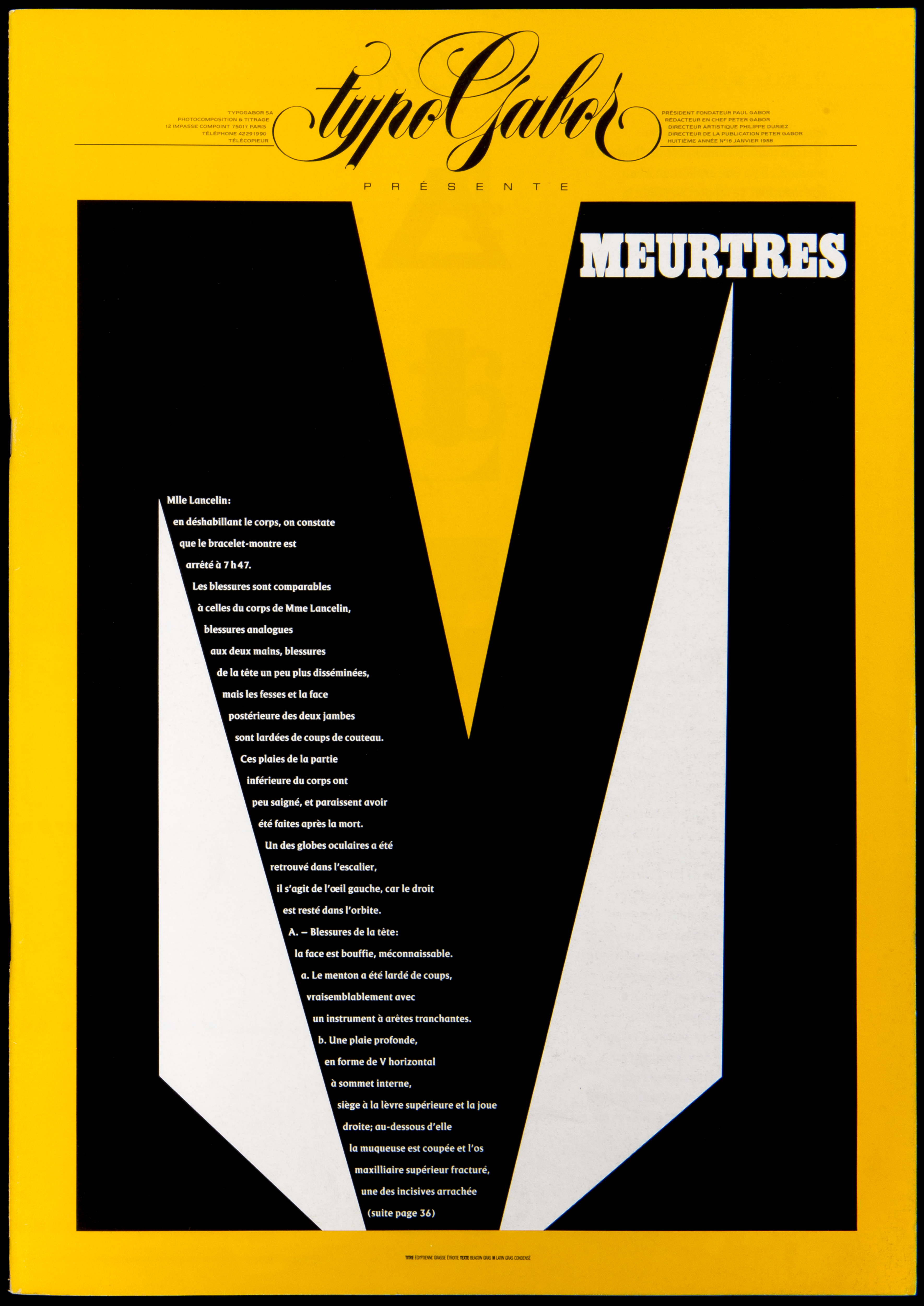 Le magazine littéraire de typoGabor était né. Plusieurs directeurs artistiques vont se succéder dans les cuisines typographiques de la maison Gabor. Bill Butt, Jérôme Binda, Philippe Duriez et pour finir Paul Gabor qui revient en 89 par une magistrale œuvre consacré aux Droits de l’Homme. L’Âge d’Homme.