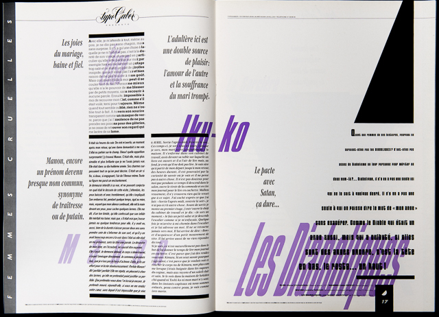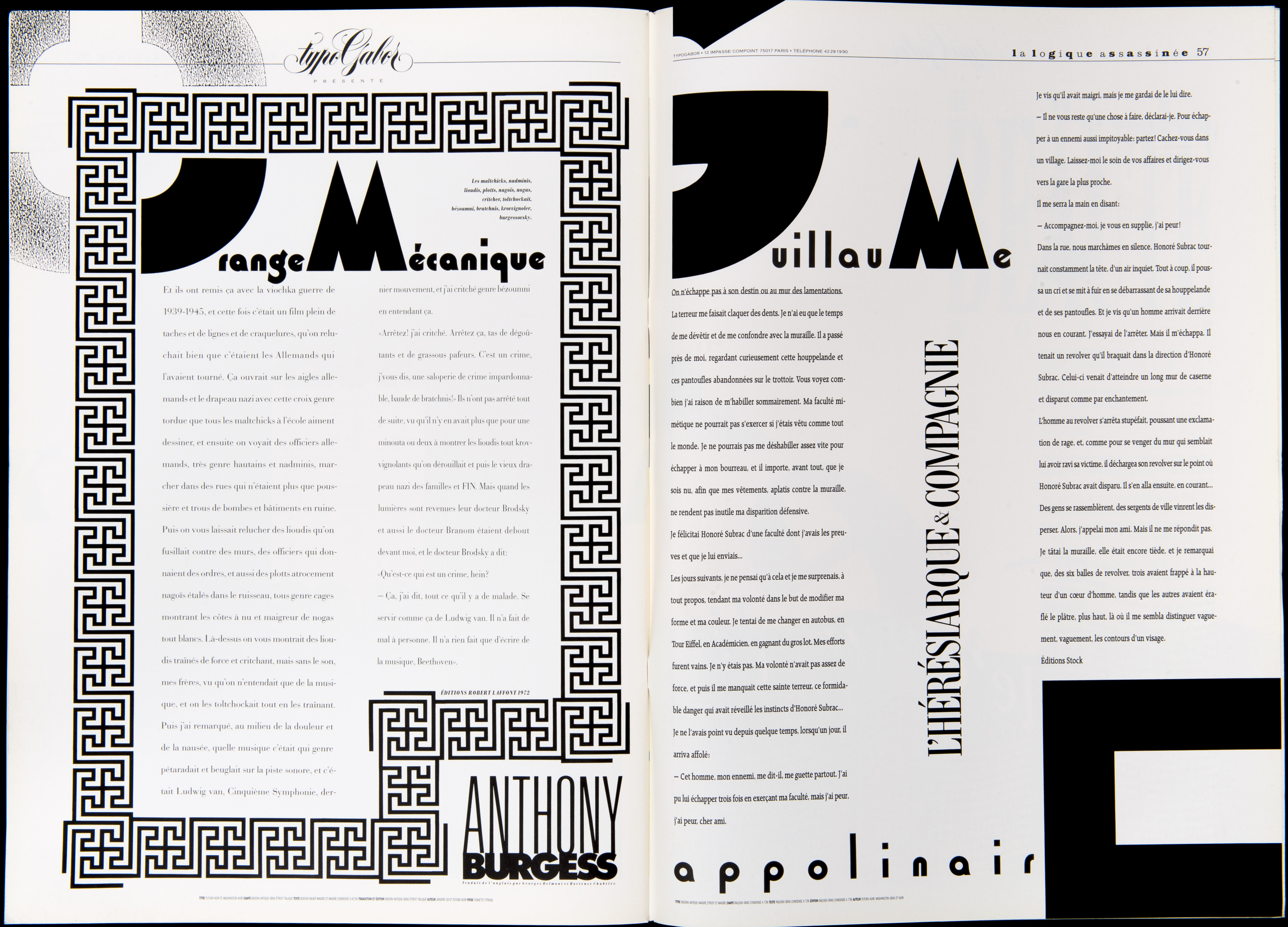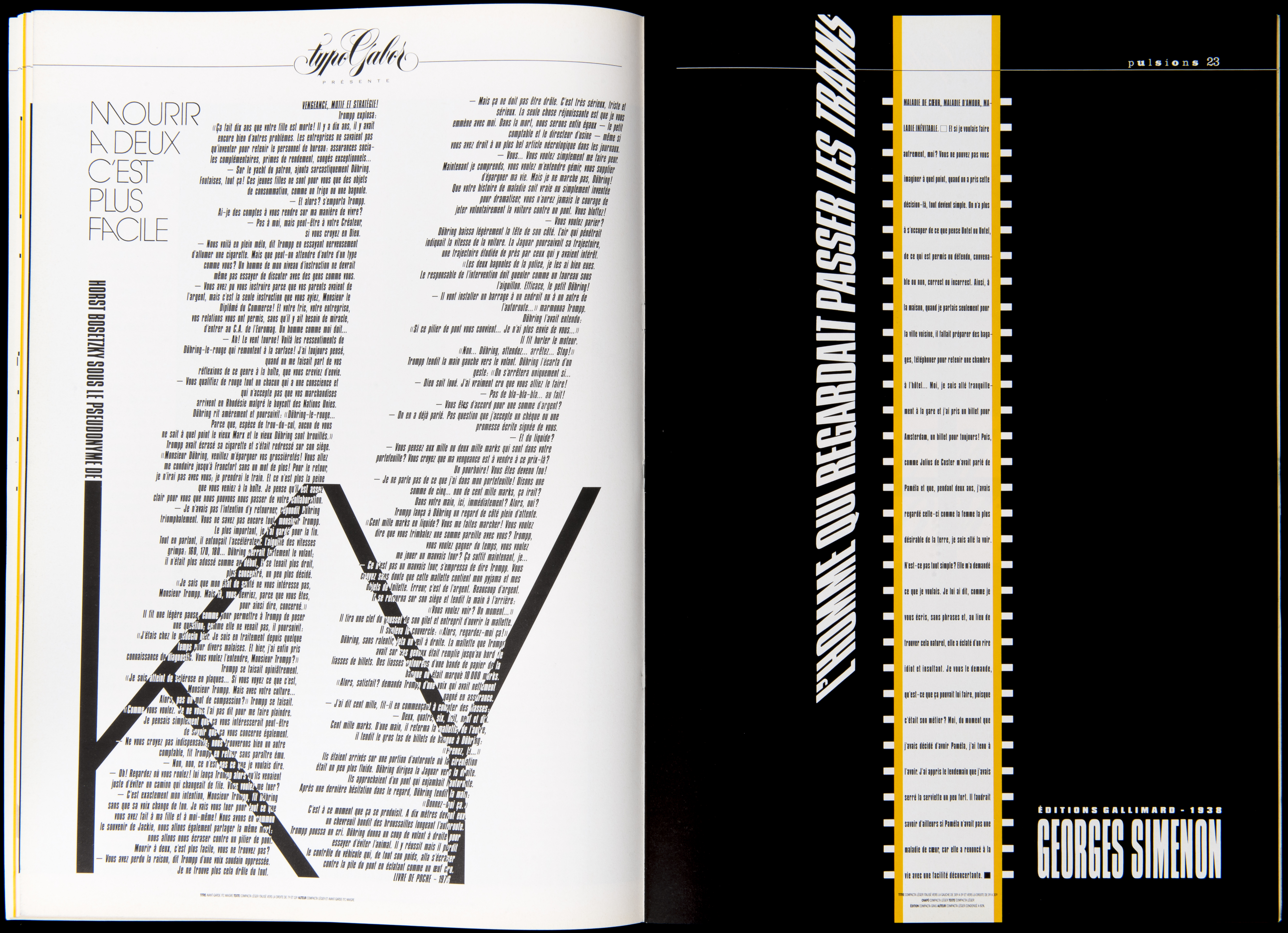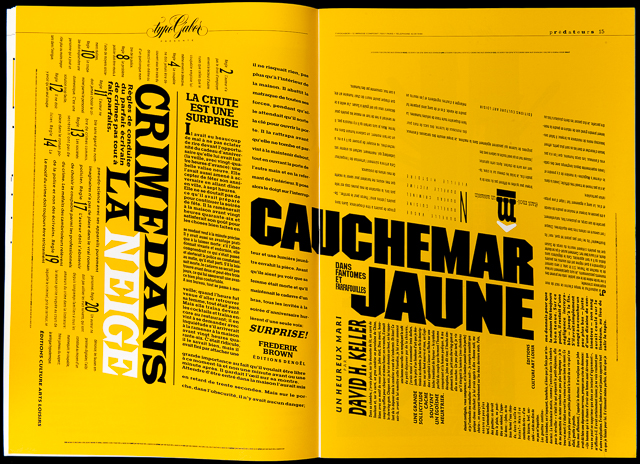Notre magazine est un lieu de réflexion, de séduction, où les remous de la forme font frissonner plus d’un graphiste, trembler les assises du classicisme, loucher l’aveugle et le borgne du sentiment, se faire violer les Calmes de la Page Blanche qui n’osent pas, de peur de… se choquer eux-mêmes. Si notre magazine pousse les outrances et les langages visuels dans les confins de l’interdit alors nous ne sommes pas loin du but recherché. Poursuivant comme un fil rouge le travail de Bill Butt, de Nathalie Baylaucq et Philippe Duriez, Jérôme Binda montre ici la maîtrise d’un sujet littéraire où il s’est pleinement investi, apprenant les textes par cœur jusqu’à les réciter obsessionnellement durant les longues nuits de calibrages et de peinture typoGraphique.